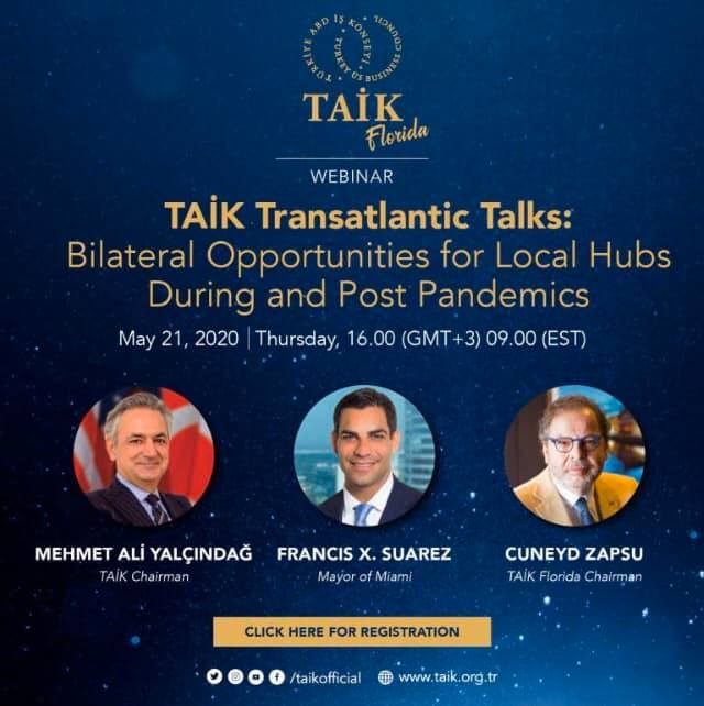 Consulate General of Turkey in Miami and Turkish American Business Council (TAIK) shall be hosting Honorable Francis Suarez, Mayor of the City of Miami, at the “TAIK Transatlantic Taks” this Thursday, May 21, 2020 at 09:00am EST.